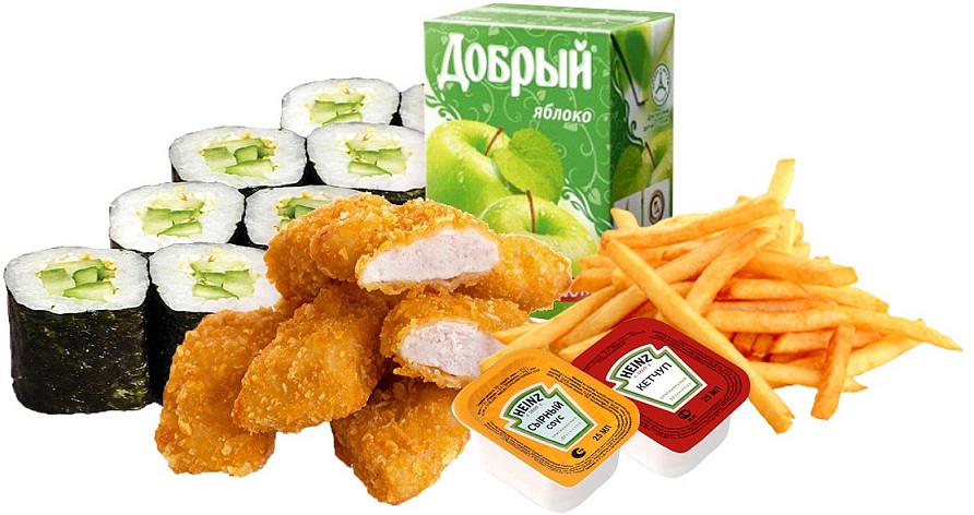 Состав: Наггетсы 9шт, картофель фри 110гр, мини ролл с огурцом, сок добрый 0.2л, кетчуп и сырный соус Heinz.