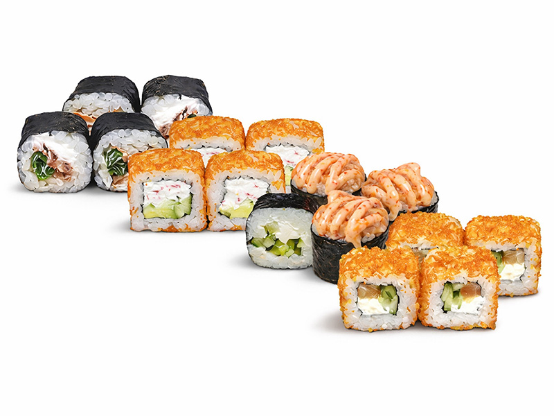 Состав: 1\2 лосось терияки, 1\2 филадельфия в масаго, 1\2 намеро, 1\2 калифорния в масаго (+ - 50гр)