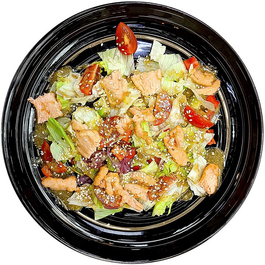 Состав: салат айсберг, лосось с\с жареный, авокадо, помидорки черри, кунжут, перец сладкий, соус фирменный, лук красный маринованный