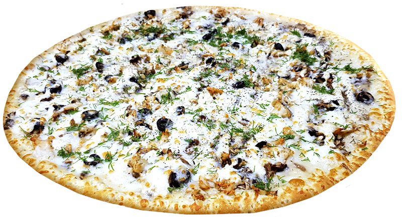 Состав: соус сметанный,соус сливочный,сыр моцарелла,шампиньоны,маслины, филе куриное, укроп, прованские травы. (+ - 50гр)