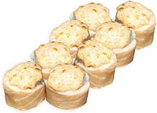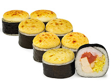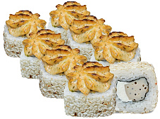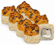 Состав: сыр сливочный, перец сладкий, курица копченая, сыр чеддер, кляр темпура, соус унаги, кунжут.
