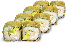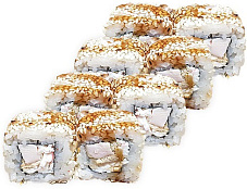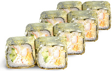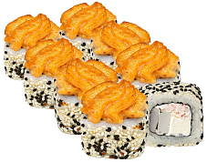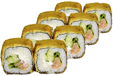 Состав: сыр сливочный, краб-крем, икра масаго, кляр темпура, огурец, соус унаги, кунжут