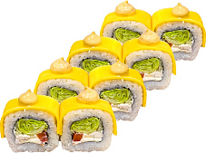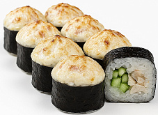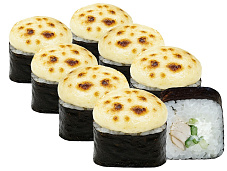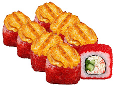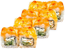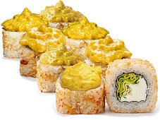 Состав: краб-крем, огурец, икра масаго, соус сырный, соус унаги, кунжут