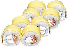 Состав: сыр сливочный, креветки коктейльные вареные, краб-крем, омлет Тамаго, соус сырный, кунжут, соус унаги