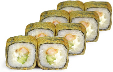 Состав: тигровая креветка в темпуре, сыр сливочный, огурец, кляр темпура, соус унаги, кунжут