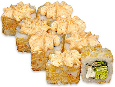 Состав: тигровая креветка в темпуре, соус Спайси, крем-краб, кляр темпура, огурец, соус унаги, кунжут